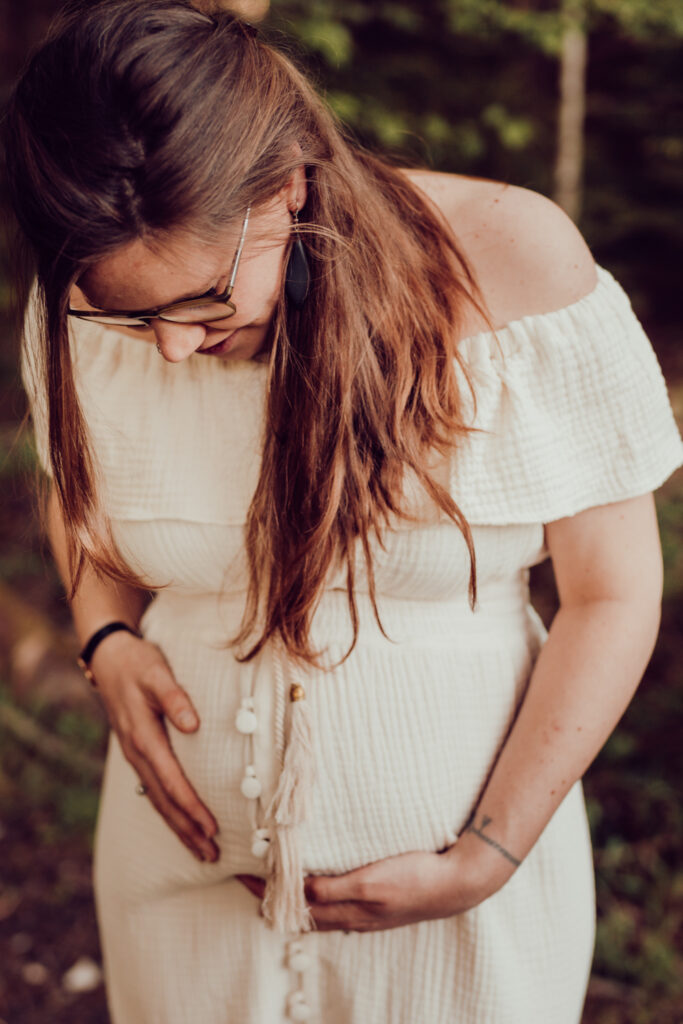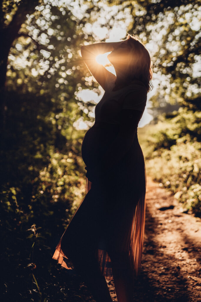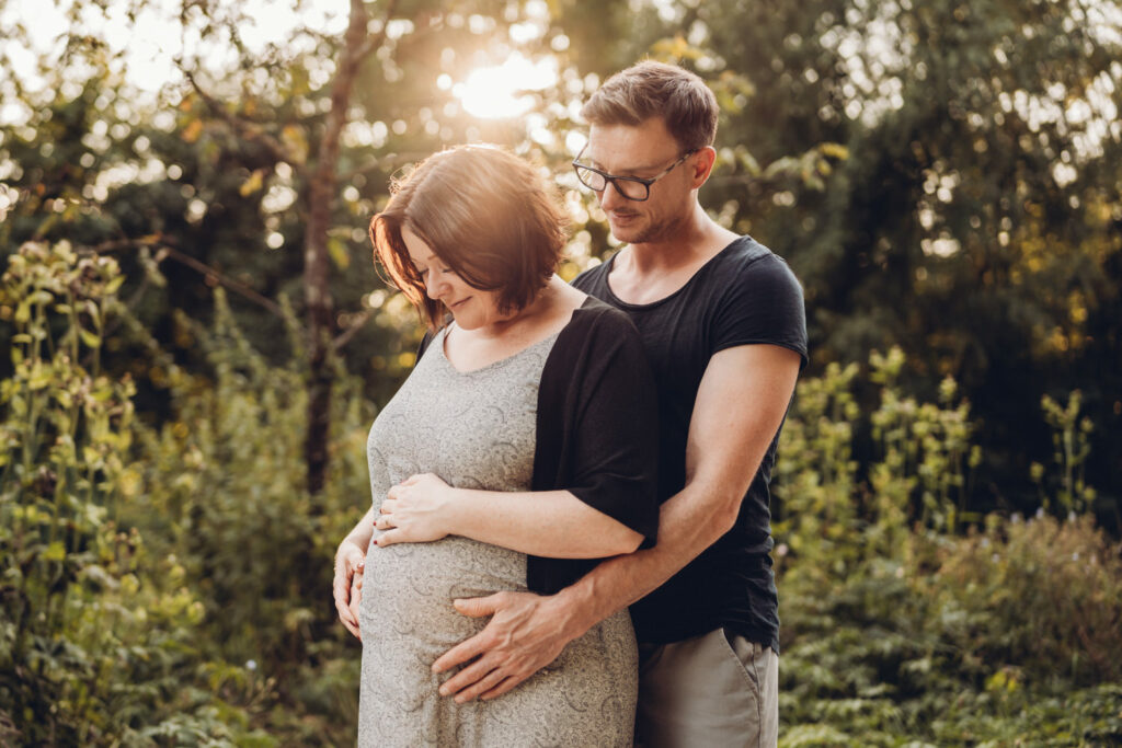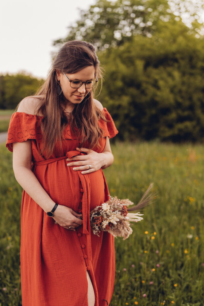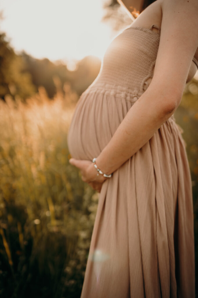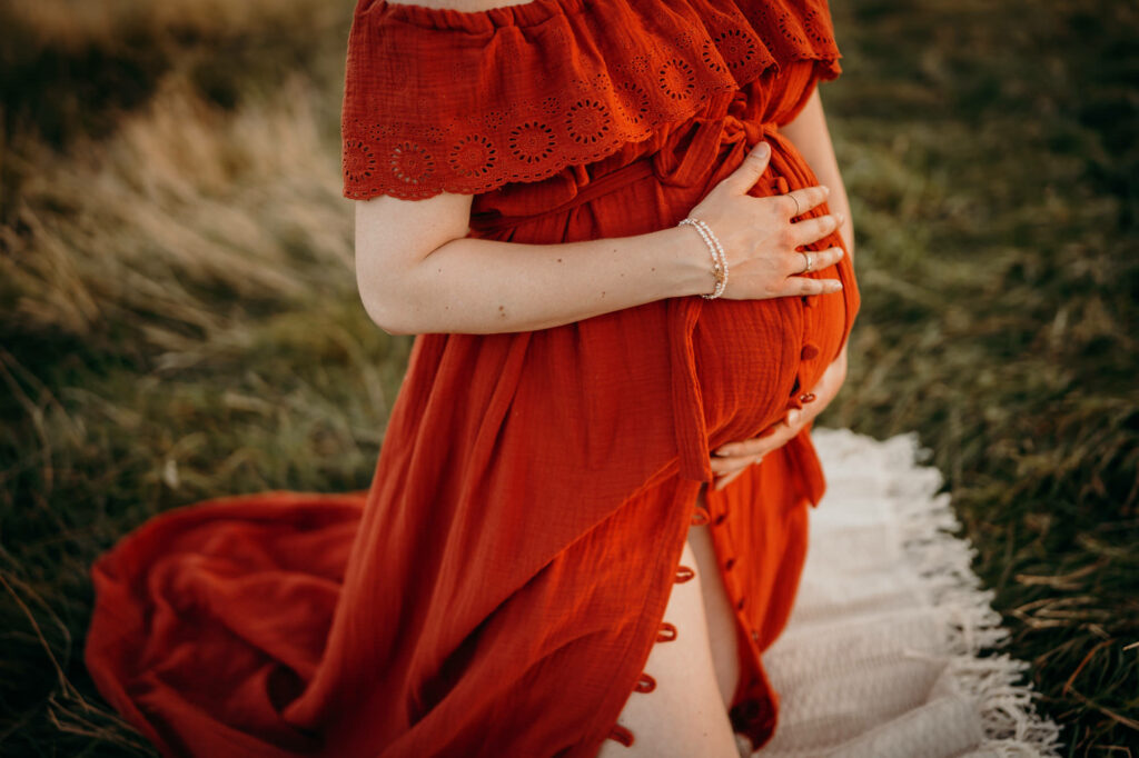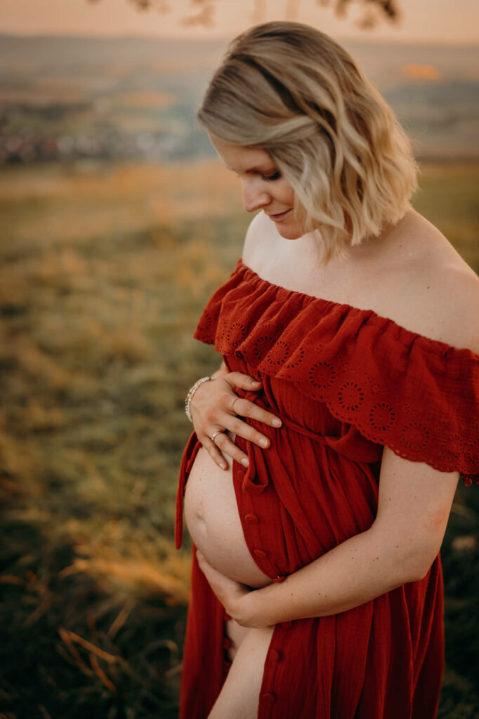 Das Bild zeigt eine schwangere Frau, die ein Beiges langes Kleid trägt und mit beiden Händen liebevoll ihren Babybauch umfasst. Sie steht auf einer Wiese und schaut verträumt zur Seite. Das Bild zeigt eine schwangere Frau in einem langen Kleid bei Sonnenuntergang elegant im hohen Gras stehend. Das Bild zeigt den Bauch einer schwangeren Frau, die auf einer Decke in der Natur sitzt. Eine Hand umfasst liebevoll den Babybauch. Das Bild zeigt eine wunderschöne schwangere Frau in einem weißen Kleid auf einer Wiese vor der untergehenden Sonne. Das Bild zeigt eine schwangere Frau in einem roten langen Kleid. Sie umfasst mit beiden Händen liebevoll ihren Babybauch. Das Bild zeigt den schwangeren Bauch einer Mama und die Hände des Papas, der ihn berührt und der gleichzeitig ein Kind im Arm trägt. Das Bild zeigt eine Familie auf der Wiese sitzend. Die Frau ist schwanger und die Hände der werdenden Mama und des Papas liegen auf ihrem Bauch.