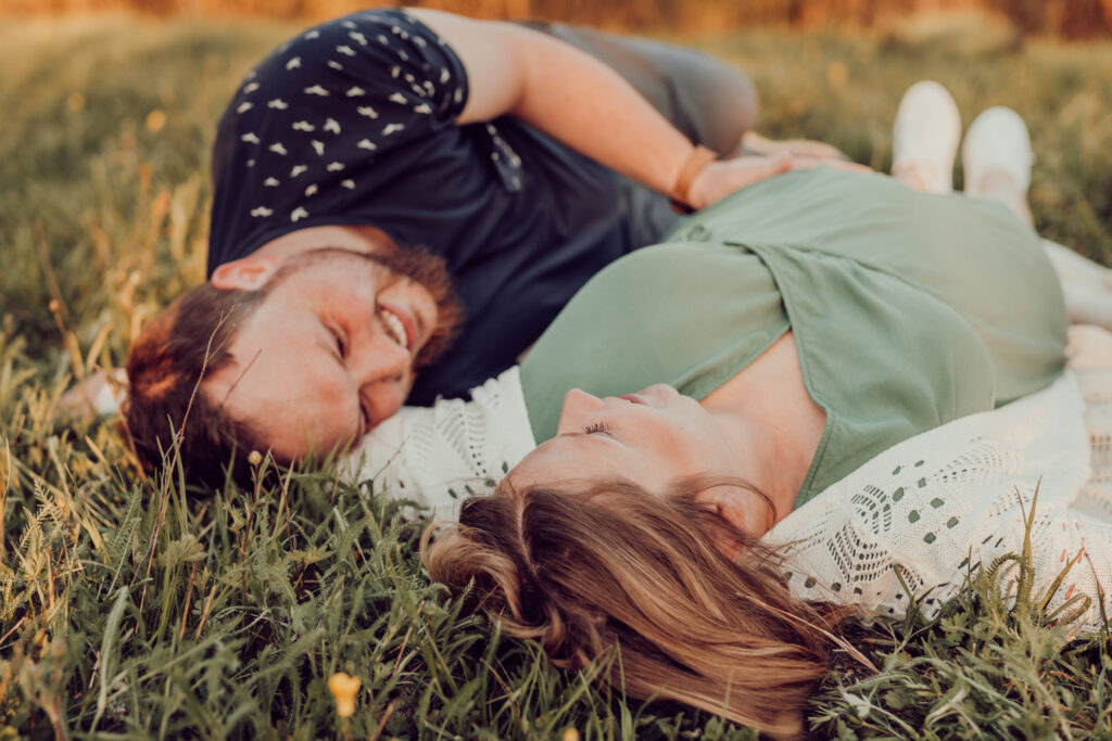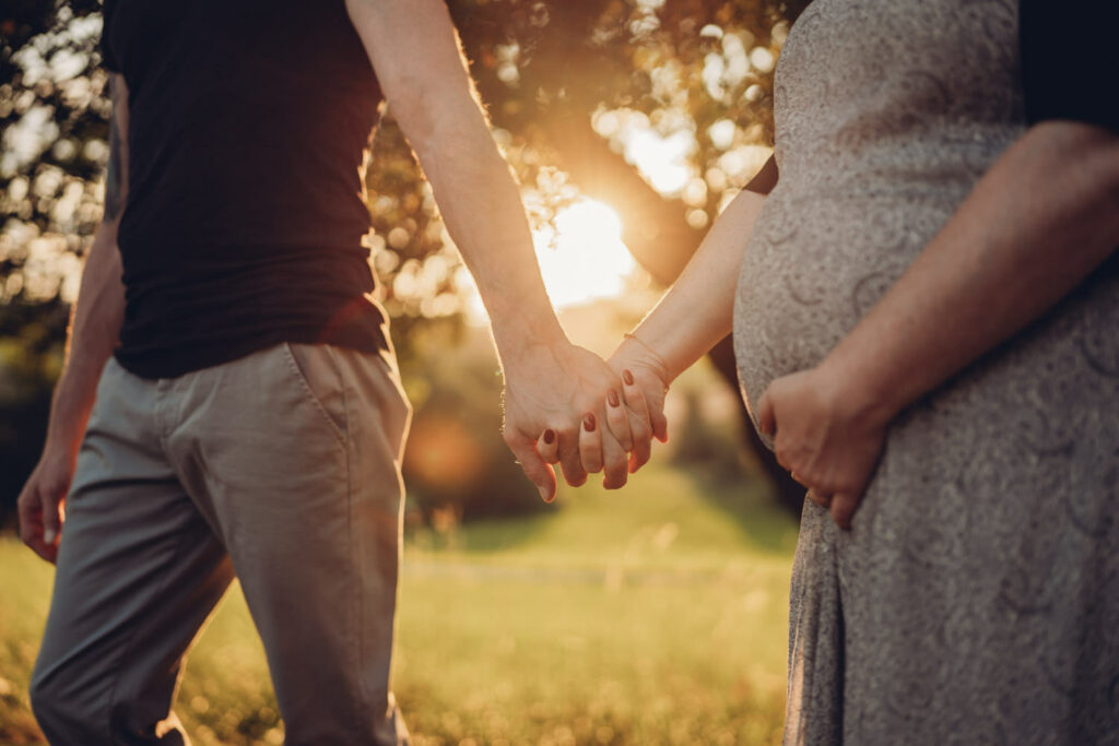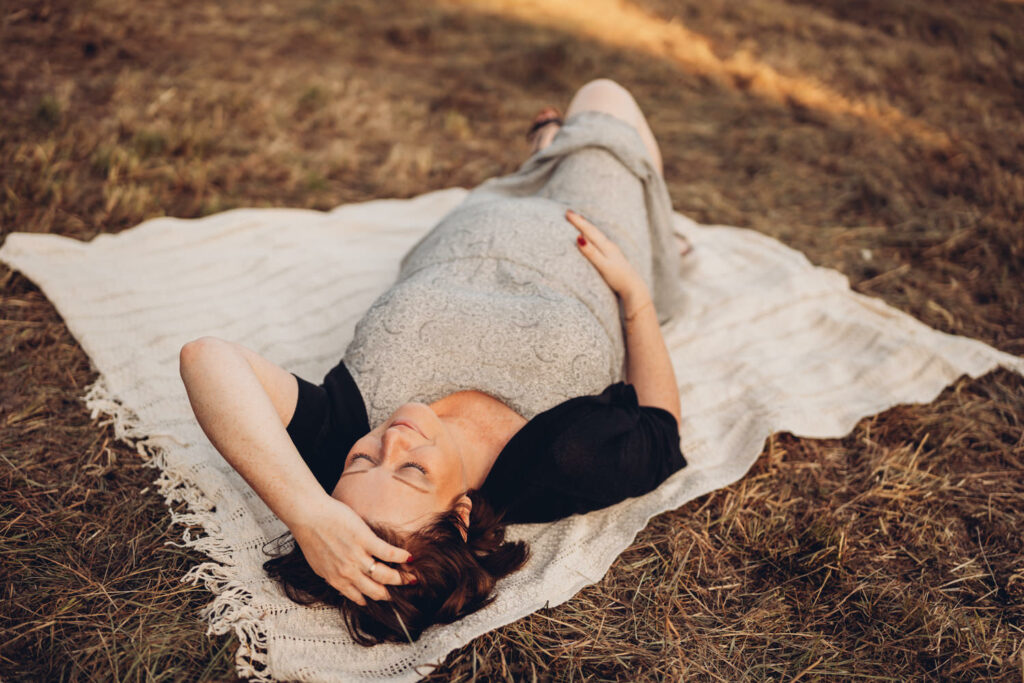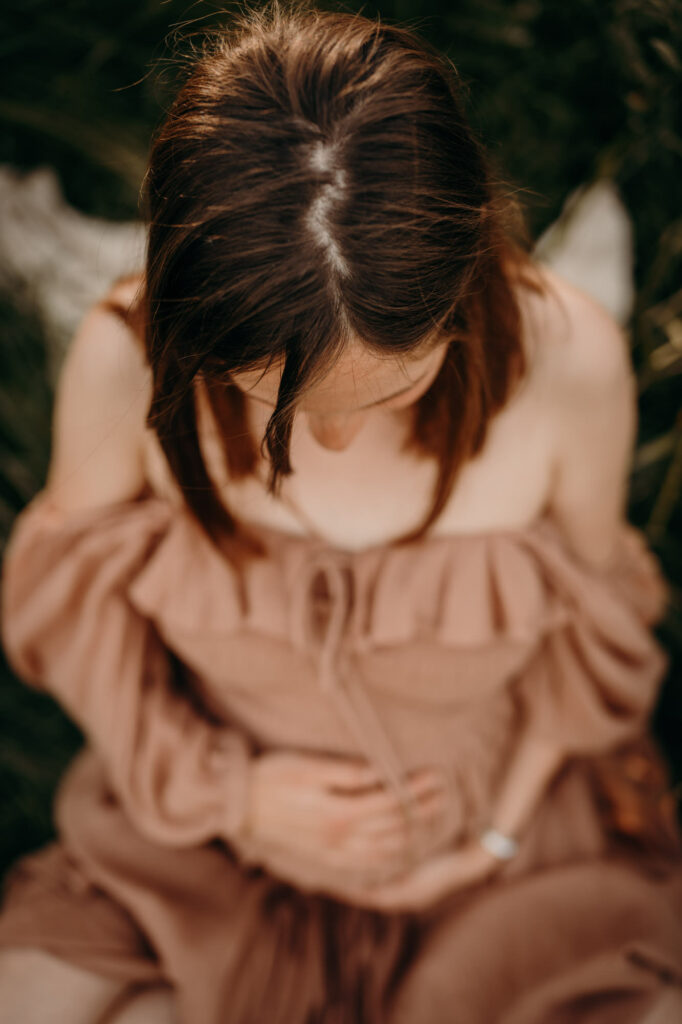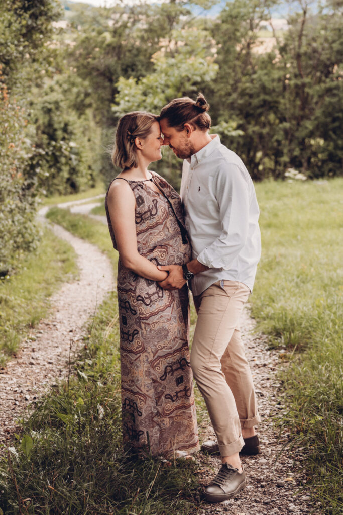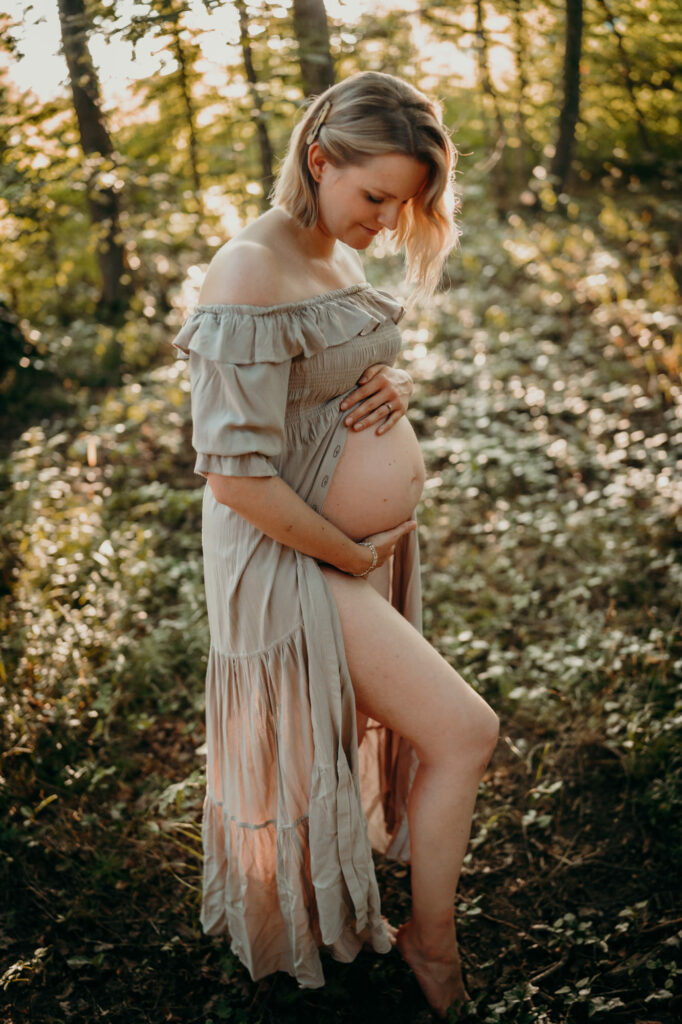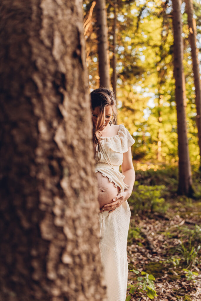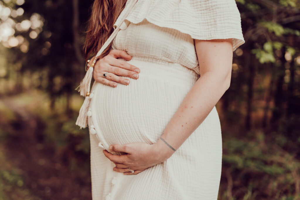 Das Bild zeigt eine schwangere Frau, die ein Beiges langes Kleid trägt und mit beiden Händen liebevoll ihren Babybauch umfasst. Sie steht auf einer Wiese und schaut verträumt zur Seite. Das Bild zeigt eine schwangere Frau in einem langen Kleid bei Sonnenuntergang elegant im hohen Gras stehend. Das Bild zeigt den Bauch einer schwangeren Frau, die auf einer Decke in der Natur sitzt. Eine Hand umfasst liebevoll den Babybauch. Das Bild zeigt eine wunderschöne schwangere Frau in einem weißen Kleid auf einer Wiese vor der untergehenden Sonne. Das Bild zeigt eine schwangere Frau in einem roten langen Kleid. Sie umfasst mit beiden Händen liebevoll ihren Babybauch. Das Bild zeigt den schwangeren Bauch einer Mama und die Hände des Papas, der ihn berührt und der gleichzeitig ein Kind im Arm trägt. Das Bild zeigt eine Familie auf der Wiese sitzend. Die Frau ist schwanger und die Hände der werdenden Mama und des Papas liegen auf ihrem Bauch.